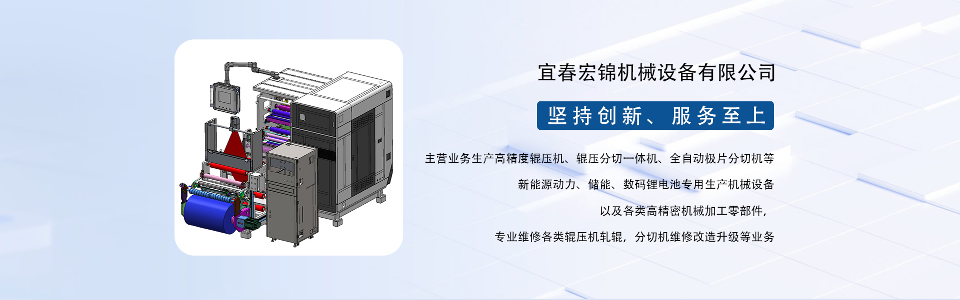 東莞市宏錦機(jī)械科技有限公司江西分公司是一家集研發(fā)、生產(chǎn)、銷售、服務(wù)于一體的創(chuàng)新型鋰電自動化精密機(jī)械設(shè)備專業(yè)制造、服務(wù)商,坐落于江西省新余市渝水區(qū)新余經(jīng)濟(jì)開發(fā)區(qū)孵化園5號廠房,廠房面積近6000平米,由東莞市宏錦機(jī)械科技有限公司于2024年11月投資新建,交通區(qū)位優(yōu)勢明顯、產(chǎn)業(yè)配套便捷集中,擁有一批具有行業(yè)豐富經(jīng)驗(yàn)的技術(shù)人員和管理團(tuán)隊(duì)。公司主營業(yè)務(wù)生產(chǎn)高精度輥壓機(jī)、輥壓分切一體機(jī)、全自動極片分切機(jī)等新能源動力、儲能、數(shù)碼鋰電池專用生產(chǎn)機(jī)械設(shè)備以及各類高精密機(jī)械加工零部件,專業(yè)維修各類輥壓機(jī)軋輥,分切機(jī)維修改造升級等業(yè)務(wù)。根據(jù)公司發(fā)展三步走戰(zhàn)略規(guī)劃經(jīng)營現(xiàn)下設(shè)三個二級獨(dú)立運(yùn)營事業(yè)部分別為分切事業(yè)部(分切機(jī)、輥壓分切一體機(jī))、磨輥事業(yè)部(輥壓機(jī)、軋輥修磨)、機(jī)加事業(yè)部(精密機(jī)械部件加工)。經(jīng)過十余年沉淀發(fā)展主要客戶有新余贛鋒、南昌維科、宜春清陶、云南路華、河南恒一、江西程疆、四川天萊、蕪湖天弋、惠州億緯鋰能、無錫盤古新能源、鄭州比克、安徽鋰天下、臺灣長利(宏基集團(tuán))、重慶維都利(紫建電子)、贛州諾威、安徽利維能、漳州萬寶、重慶佳寶成、廣西皇冠儲能等一批具有行業(yè)知名度和影響力的企業(yè)。公司在新能源發(fā)展的道路上堅持創(chuàng)新,為客戶帶來穩(wěn)定、高效的自動化專用設(shè)備和更大的收益。